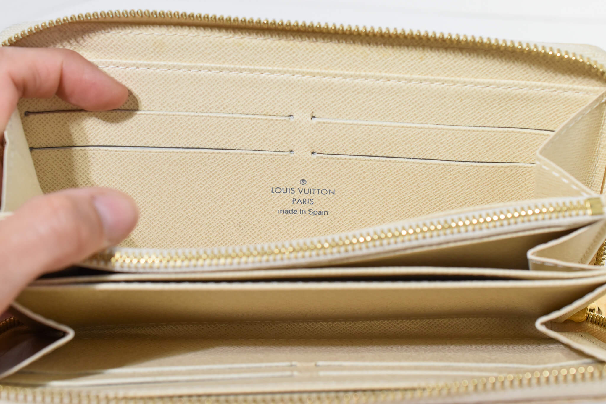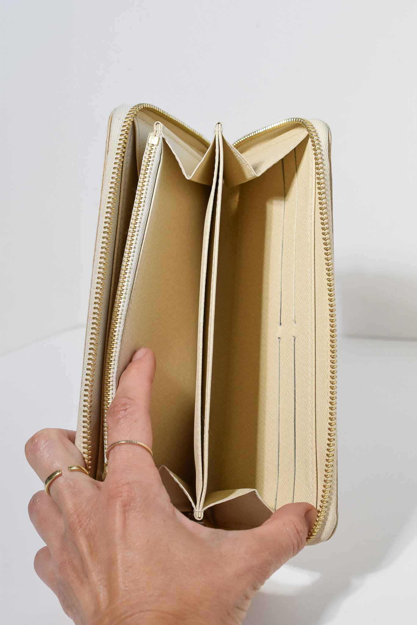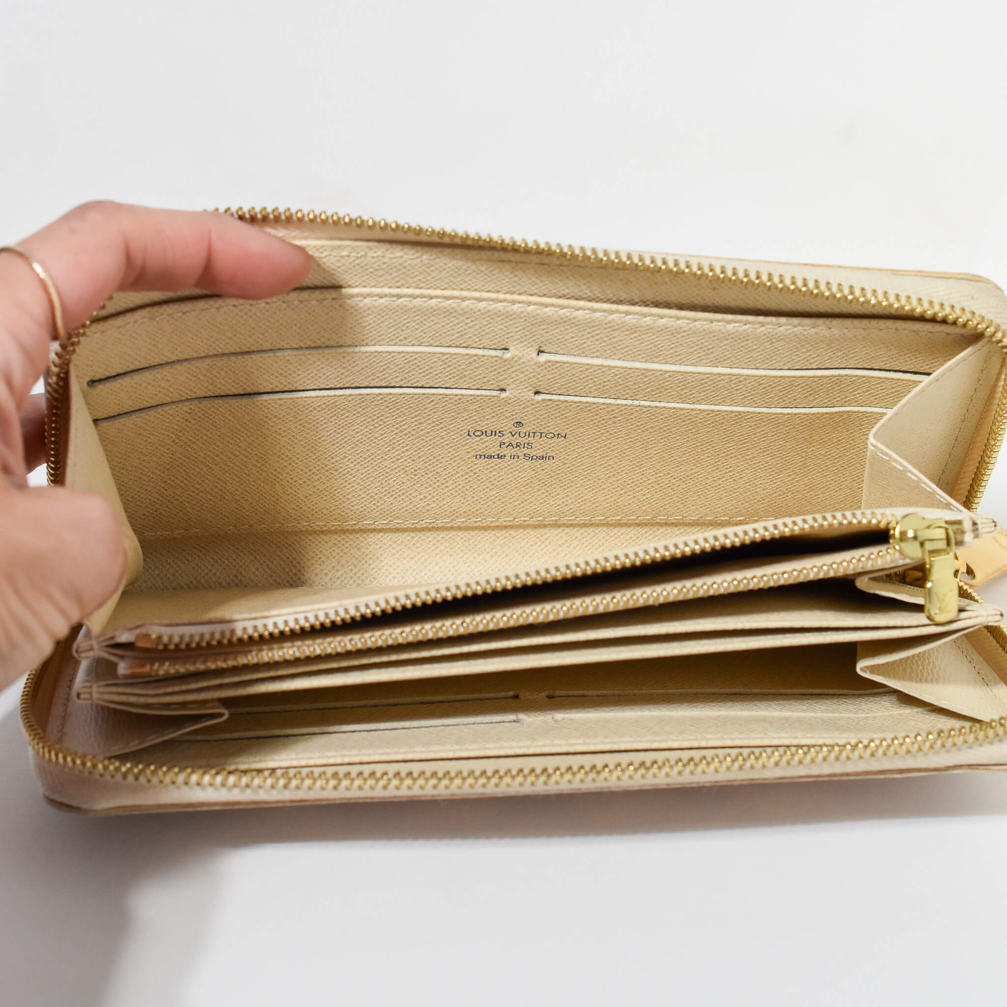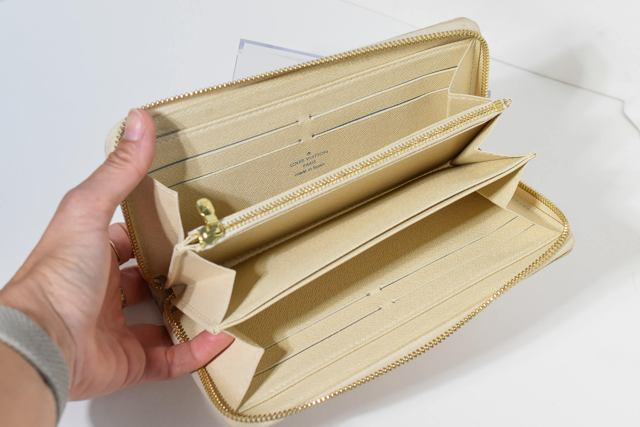 The wallet has a 3/4 wrap-around polished brass zipper that opens to an ivory leather interior with a center zipper pocket and card slots. Its hard to find Damier Azur in such excellent condition.