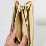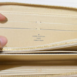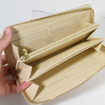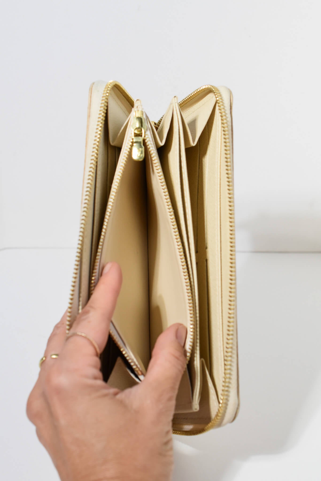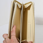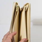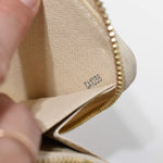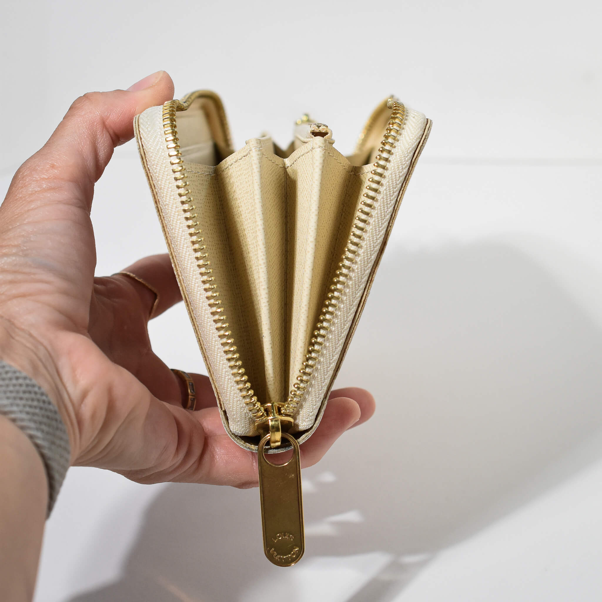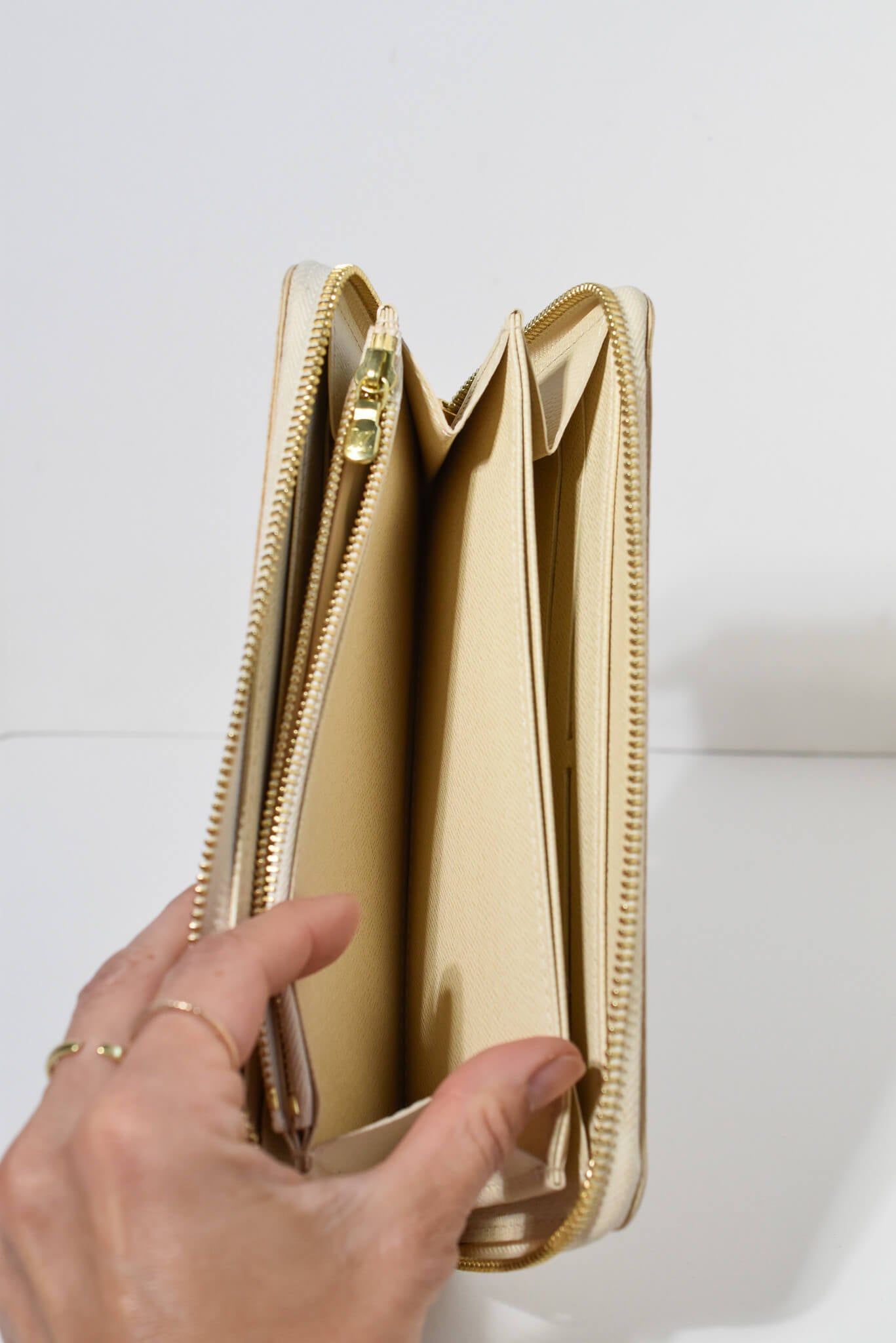 The wallet has a 3/4 wrap-around polished brass zipper that opens to an ivory leather interior with a center zipper pocket and card slots. Its hard to find Damier Azur in such excellent condition.