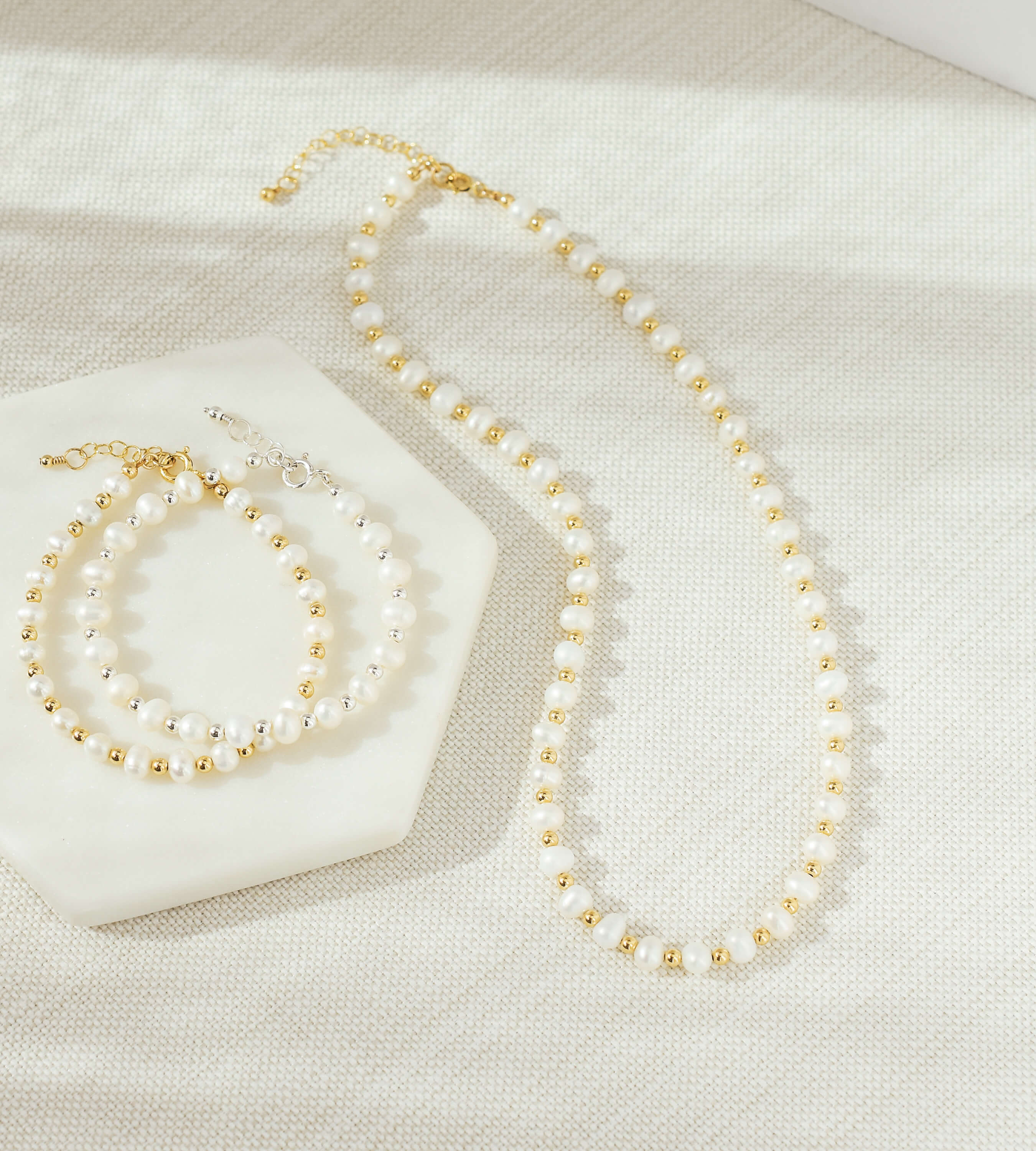 string of freshwater pearls paired with gold or silver beads can truly be your dress-up for a fancy occasion or casually layered with your a cute T-shirt and vintage jean for the perfect everyday look.