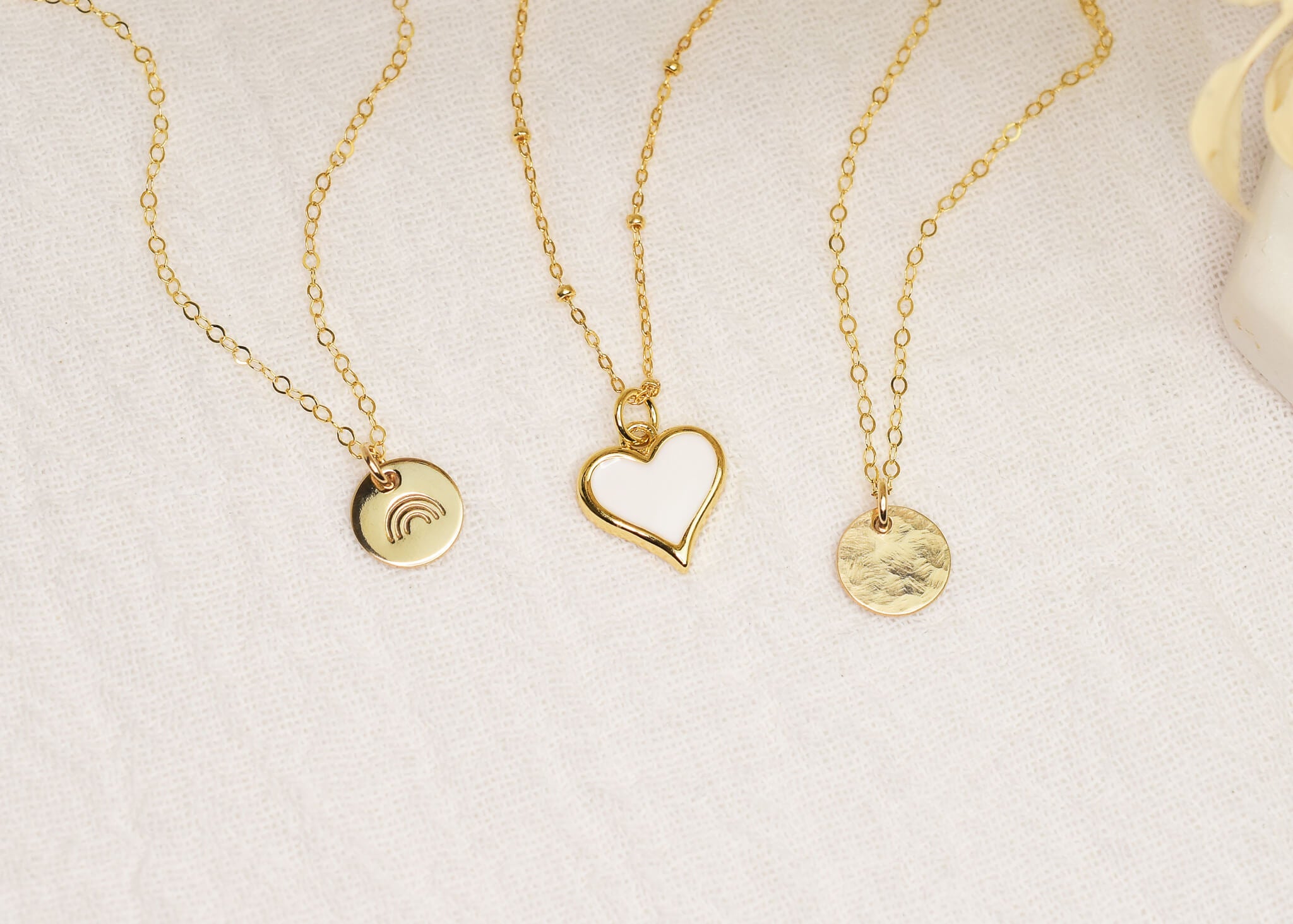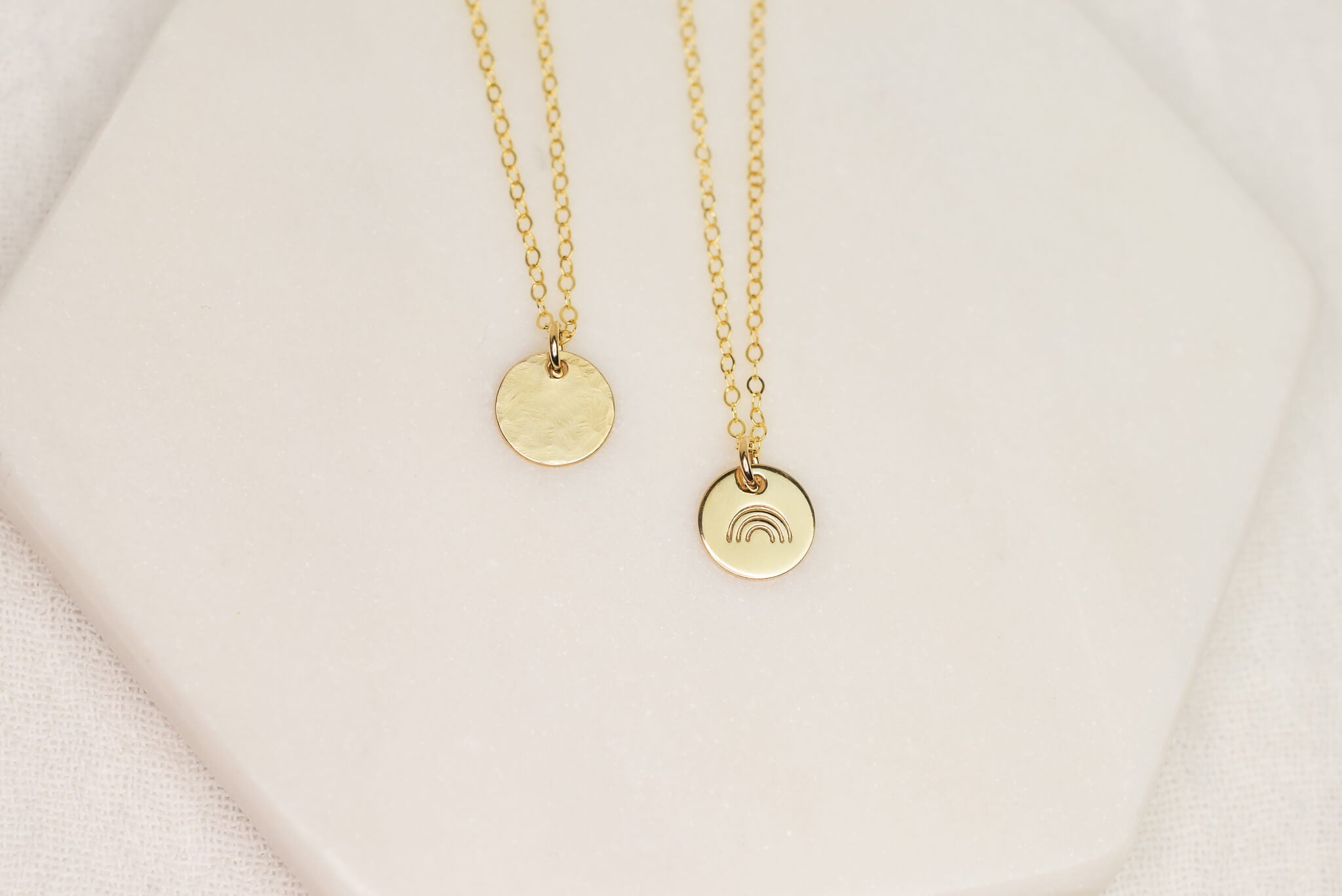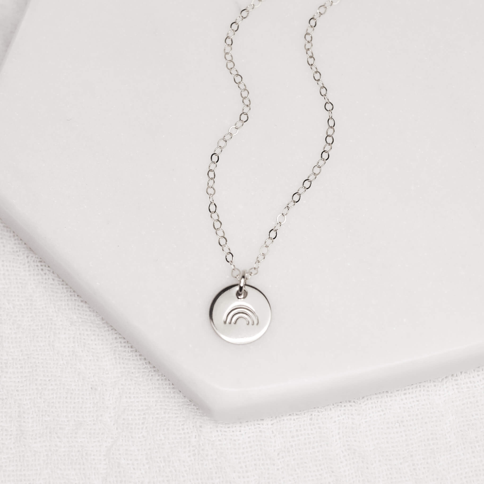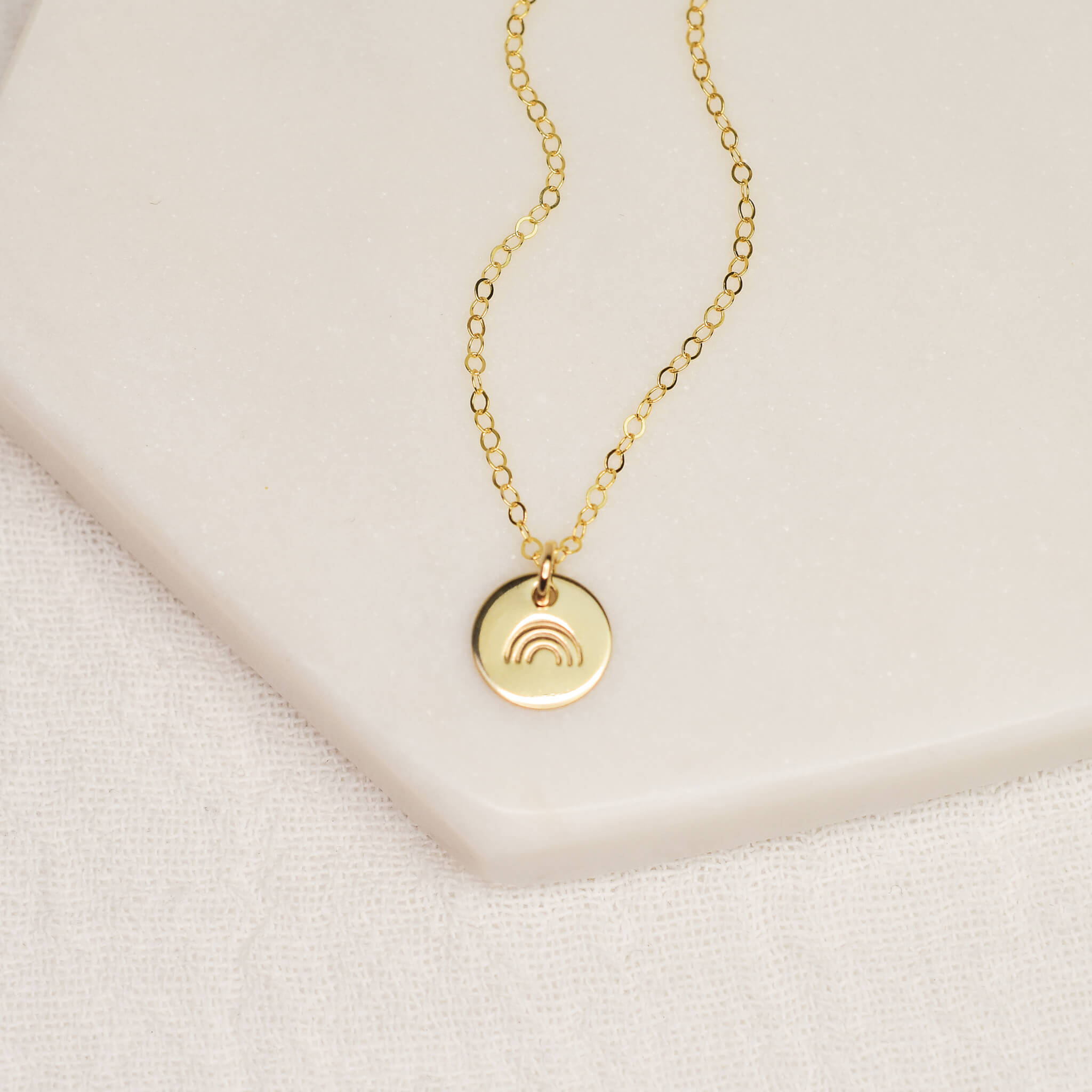 Shine on the daily with our new tiny rainbow necklace! A great minimal piece to wear alone or layer with your other favorites. We love it with a choker or one of our layering chains like Lover, River, or Willow.  A tiny rainbow is hand-stamped on your choice of 14k gold fill or sterling silver.